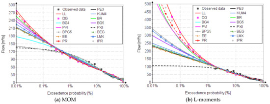 Figure 4 shows the fitting distributions for annual maximum flow for the Prigor River. For plotting positions, the Nguyen formula was used [30,31].