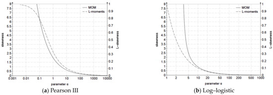 In hydrological frequency analysis, to estimate the parameters of the distributions, the method of ordinary moments (MOM) and three-parameter distributions are used, as well as the method of linear moments (L-moments) using distributions chosen based on the L-skewness ()–L-kurtosis () variation criterion, recommended for distributions of at least four parameters. These parameter estimation methods are two of the most frequently used parameter estimation methods in hydrology, which is the reason for presenting only these two [3,6,11,16].