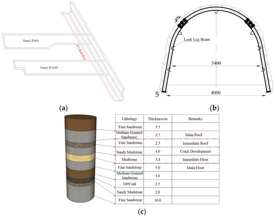 Zhuxianzhuang Coal Mine is located in Suzhou City, Anhui Province, China. The II5 Rail Rise of this mine is a roadway with straight walls and a semicircular arch (4.0 m width × 3.4 m height). The straight walls are 1.4 m in height and 450–678 m in buried depth (Figure 1a). The selected roadway, 600 m in buried depth, is located in sandy mudstone where internal cracks are developed and the range of the test loose circle exceeds 2.0 m. Therefore, the surrounding rock is weak, broken, and of poor integrity. The roof and floor are 2.5 m thick fine sandstone and 3.4 m thick mudstone, respectively. Figure 1c shows the comprehensive geological histogram. According to Figure 1c, initially, the II5 Rail Rise adopts the U29-type shed symmetrical support, in which the overlapping length of the beam legs is 400 mm; the tightening torque of nuts is not less than 300 mm; and the spacing of the sheds is 500 mm.