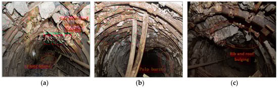 Roadway damage in test section. (a) Floor heave and side-beam and top-beam bending; (b) Pulp burst; (c) Rib and roof bulging.