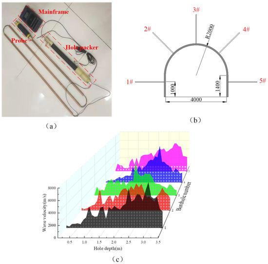 Surrounding rock loose circle test. (a) CT2 mine ultrasonic surrounding rock crack detector; (b) test borehole arrangement; (c) test results.