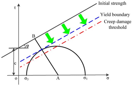 Through rheological tests, Aydan and Nawrocki disclosed that the time dependence of the cohesion is much stronger than that of the internal friction angle [24]. Therefore, when the internal friction angle is ignored, the time-dependent change in the strength line position can be transformed into the time-dependent attenuation of the cohesion.