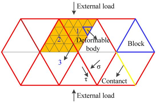 The strength attenuation of blocks can be transformed into the strength attenuation of the contact surface through the conversion coefficient K. The conversion coefficient of the GBM-TtoF creep model is the defined damage coefficient, but the model in this study defines the conversion coefficient K based on the crack static fatigue failure mechanism [27] and software characteristics. The mechanism of the strength attenuation of the contact surface is illustrated in Figure 5. The contact surface between blocks 1 and 2 is called contact surface 3. Since the strength attenuation of contact surface 3 is jointly controlled by the strength attenuation of blocks 1 and 2, the strengths of the blocks can be applied to the strength of the contact surface through strength conversion. In fact, many deformable bodies exist in a block, and they also follow the law of strength attenuation. The stress states of deformable bodies in the block differed as a result of stress concentration. Therefore, we could monitor the stress states of deformable bodies inside the block using the FISH function and record the number of deformable bodies exceeding the rheological damage threshold; afterwards, through dividing this number by the total number of deformable bodies inside the block, the conversion coefficient K was obtained: