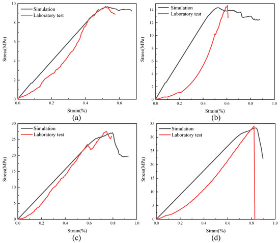 Comparison of uniaxial compression simulation curves and laboratory test curves. (a) coal; (b) mudstone; (c) medium-grained sandstone; (d) fine sandstone.
