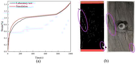 During rheological parameter calibration, the block used the CVISC rheological model, and the contact surface used the strength attenuation model. The basic calibration steps included: the parameter calibration of single blocks, the parameter combined calibration of the contact surface block, and the completion of parameter calibration. Table 3 shows the calibrated rheological parameters of sandy mudstone. Figure 7 contrasts the rheological simulation and test results of sandy mudstone. It can be found that these two results share basically the same macroscopic crack distribution characteristics. The simulation results are more accurate in capturing the fracturing damage at the upper left and lower right corners of the sample, and they well describe the three stages of the rheology of sandy mudstone. The simulation results of accelerated rheology time and final deformation are basically consistent with the test results.