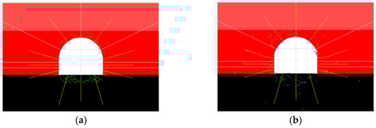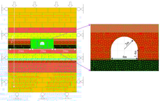 Based on the above calibrated rock stratum parameters and the geological conditions of the mine, a model of the II5 Rail Rise in Zhuxianzhuang Coal Mine was established. The model is 60 m long, 75.4 m high, and the roadway cross-section is in the shape of a semicircular arch (4.0 m × 3.4 m, wide and high) and straight walls (1.4 m high) (Figure 8). The models and parameters for each rock stratum were consistent with the calibrated values. To improve the calculation efficiency, triangular block division was carried out only in the area whose four sides were 8 m above the roof, 8 m below the floor, and 8 cm away from the left and right sides of the roadway center, respectively. The horizontal displacement constraint was set on the left and right boundaries of the model, and the vertical displacement constraint was set on the floor boundary of the model. A 20 m long area was reserved on the left and right sides of the model to avoid the boundary effect. A 1.885 MPa equivalent load of overlying strata was applied to the upper boundary of the model. Based on the roadway buried depth, the vertical stress was 15 MPa and the vertical stress gradient was 0.025 MPa/m. According to the recorded data, the lateral pressure coefficient of Zhuxianzhuang Coal Mine is 1.6. Therefore, the horizontal stress was 27.016 MPa and the horizontal stress gradient was 0.04 MPa/m in the model. The simulation procedure was as follows: (1) a model based on the geological histogram was established, and calibrated parameters were assigned to each rock stratum; (2) the initial state of gravity-induced ground stress was calculated; (3) the II5 Rail Rise was excavated and supported; (4) the parameters of the roadway support were changed. Finally, the deformation and crack evolution of the roadway surrounding rock under different support parameters were analyzed.