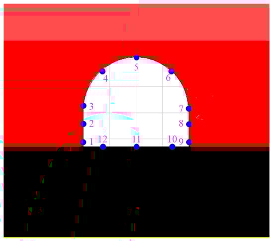 To analyze the deformation characteristics of the roadway surrounding rock, the horizontal displacement and vertical displacement of the roadway were analyzed through the displacement nephogram and measuring point data. With reference to the analysis results, twelve measuring points were set on the roadway surface to measure the displacement of the ribs, the roof, and the floor. The locations of the measuring points are given in Figure 9.