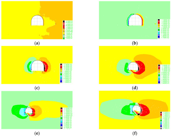 Horizontal displacement nephograms of roadway on different days. (a) 1st d; (b) 5th d; (c) 50th d; (d) 200th d; (e) 250th d; (f) 300th d.