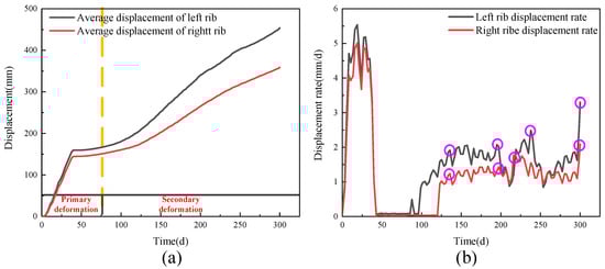 Figure 11 gives the average deformation amount and rate of the two ribs. The average deformation data of the two ribs were taken from the average values of the measured data. The displacement of the left rib was significantly greater than that of the right rib, showing asymmetric deformation. Both ribs presented obvious rheological characteristics. The deformation rate was derived from the displacement curve. The deformation rate of the left rib was significantly greater than that of the right rib. The maximum deformation rates of the left and right ribs appeared on the 18th day: 5.5 mm/d and 5.0 mm/d, respectively. In the secondary deformation stage, the deformation rate increased in fluctuations. With the displacement rate of the left rib as an example, there were four obvious increases: on the 135th day (1.8 mm/d), the 197th day (2.1 mm/d), the 237th day (2.5 mm/d), and the 300th day (3.3 mm/d), respectively, and this displacement tended to keep rising. The time intervals of the four accelerations were 62 days, 40 days, and 63 days, respectively (average value: 55 days); the deformation accelerated by 16.7%, 19.0%, and 28.6%, respectively (average value: 21.4%). These statistics indicate that in the absence of further control measures, the deformation of the roadway surrounding rock accelerated by 21.4% every 55 days on average after it entered into the accelerated deformation stage.