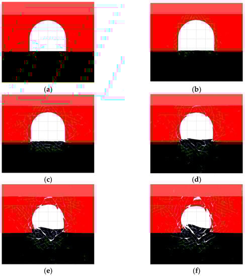 Distribution characteristics of cracks in roadway surrounding rock with the passage of time. (a) 1st d; (b) 5th d; (c) 50th d; (d) 200th d; (e) 250th d; (f) 300th d.