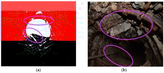 Comparison between on-site damage characteristics and simulated damage characteristics of the roadway. (a) simulated damage characteristics; (b) on-site damage characteristics.