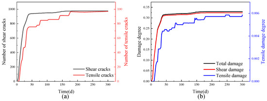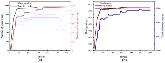 Figure 14 shows the evolutions of the number of cracks and damage degree over time in the monitored area. In the simulation, the total length of the contact surface of the surrounding rock in the monitored area was counted using FISH. The shear crack length and tensile crack length generated during the rheological process were monitored, and the damage degree of the test sample was defined by the ratio of the crack length to the total length of the contact surface. The development of shear cracks, the total damage, and the shear damage displayed obvious rheological characteristics. With reference to the development of shear cracks and tensile cracks, the whole process can be divided into three stages. In Stage I (0–40th day), i.e., the decelerated deformation stage of rheology, massive shear cracks were generated. The damage of the surrounding rock was mainly caused by shear damage. The shear damage curve and total damage curve coincided greatly. In Stage II (40th–125th day), i.e., the constant-rate deformation stage of rheology, shear cracks increased at a constant rate first; then, as the cracks expanded to the deep area, the shear cracks grew faster, and the number and damage of tensile cracks jumped. In Stage III (125th–300th day), i.e., the accelerated deformation stage of rheology, the number of shear cracks and the corresponding damage continued to increase at basically the same rate as that in Stage II, and the number of tensile cracks and the corresponding damage rose notably, causing obvious roadway destruction. On the 300th day, the number of cracks totaled 2002, including 1765 shear cracks (accounting for 88.2%) and 237 tensile cracks (accounting for 11.8%). It can be seen that the cracks in the surrounding rock were mainly shear ones. The cumulative number of shear cracks in Stages I and II is 1331, accounting for 75.4% of the total number of shear cracks. In Stage III, the number of new shear cracks is 434, accounting for 24.6% of the total number of shear cracks. In Stages I and II, the cumulative number of tensile cracks was 83, accounting for 35% of the total number of tensile cracks. In Stage III, 154 new tensile cracks occurred, accounting for 65% of the total number of tensile cracks. Shear cracks mainly appeared before Stage III, while tensile cracks mainly grew in Stage III.