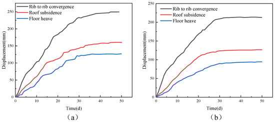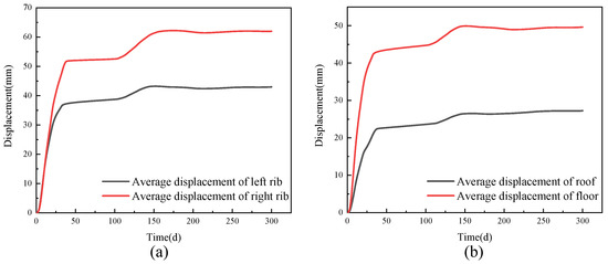 Average displacement of two ribs, roof, and floor of the roadway. (a) ribs; (b) roof and floor.