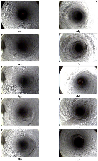 Comparison of borehole observation results before and after crack filling. (a) roof 1.0 m; (b) roof 1.0 m (filling); (c) roof 5.0 m; (d) roof 5.0 m (filling); (e) left rib 1.0 m; (f) left rib 1.0 m (filling); (g) left rib 5.0 m; (h) left rib 5.0 m (filling); (i) right rib 1.0 m; (j) right rib 1.0 m (filling); (k) right rib 5.0 m; (l) right rib 5.0 m (filling).