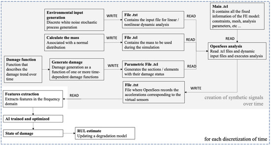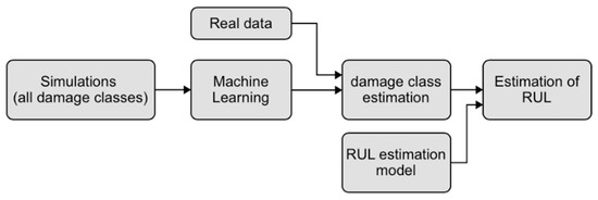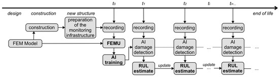 Figure 18. All the techniques developed and presented in this paper are designed for estimating the remaining useful life. Once the construction of the structure is completed and the monitoring infrastructure is properly installed, it is possible to update the FE model based on the recorded data (FE model, which could end up being the same model used for the design of the structure). In this way, we obtain the FE model needed for the AI training. This FE model will undoubtedly be more accurate than an outdated model as a result of the optimization problem. In this way, we will minimize the model error in the AI that will be trained with the signals derived from this FE model. Once the training phase is complete, we will have an AI that can estimate the damage (with some accuracy and therefore uncertainty in the estimate) and we can use this information as input for estimating the remaining useful life. At this point, every time we perform a registration, we will estimate the damage over the previously trained AI and iteratively update the RUL calculation.