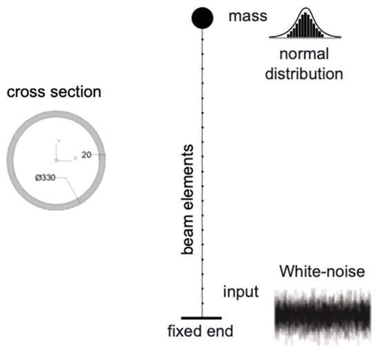 A simple cantilever column embedded at the base and supporting a vertical load and mass at the top was selected to test the concept. The column is 6 m high and has a circular–pipe cross-section with an outer diameter of 330 mm and a thickness of 20 mm. The damage was simulated simply as a uniform, general reduction in thickness due to corrosion, without capturing the electrochemical corrosion process. The structure type and geometry could be related to columns of industrial buildings, residential buildings, bridges, and wind turbines. The column was modeled by 20 beam elements (