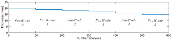 Figure 16 shows the comparison between the thickness lost in the corrosion process associated with the assumed corrosion rate, i.e., the thickness reduction entered in the FE model, as well as the AI prediction. The discontinuity of the latter is due to the AI training phase, where the recognition of a corrosion thickness with a sensitivity of 1mm was set. One could have opted to create a training scheme with higher sensitivity, say 0.5 mm, in the training phase. However, this would certainly have lowered the accuracy, as the AI would have struggled more to recognize a smaller variation in the extracted features (e.g., natural frequency). The number of analyses to be performed is another important aspect affecting the choice of the training scheme. As mentioned before, seeking a more sensitive and accurate AI results in an increase in the number of signals to be created, which may be far from negligible. Herein, the proposed AI represents a good compromise between training time, sensitivity, and accuracy, even if it sets up a discontinuous trend. The best compromise between computational time and sensitivity will be the object of future developments.