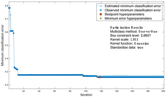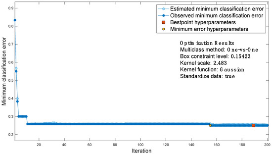 The red square indicates the iteration corresponding to optimized hyperparameters. Such hyperparameters do not always yield the minimum observed classification error. Bayesian hyperparameter optimization chooses the set of hyperparameters that minimizes a higher confidence interval of the objective model of the classification error, rather than the set that minimizes the classification error.