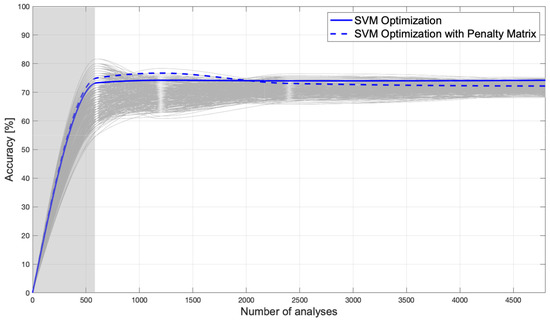 Figure 12 shows how well Bayesian optimization fits. Nevertheless, Bayesian optimization succeeds in finding one of the best possible AIs, but not the absolute best, because AIs with higher accuracy can be seen from the figure. Thus, one could argue that Bayesian optimization allows one to find an excellent (not the best) AI without having to perform many iterations to understand its variability and then take its maximum; the solid blue line remains close to the upper bound.