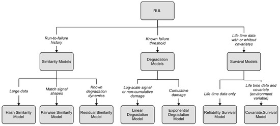 Figure 14 shows the different methods for calculating RUL. The choice of the most effective method depends on the system and the available data. The degradation model method is used when undamaged state data are available and a safe threshold can be defined. It is possible to use this information to update a mathematical model of degradation to a performance indicator and then use the history recorded up to that point to predict how the indicator will change in the future. In this way, it is possible to statistically estimate the remaining time before the indicator reaches the imposed threshold and, thus, the RUL. A linear degradation model can be used for this purpose if the system does not experience cumulative degradation. The mathematical model describes the physical process of degradation as a stochastic linear process. If, on the other hand, the system experiences cumulative degradation, an exponential degradation model is used, in which the physical process of degradation is modeled by an exponential stochastic process.
