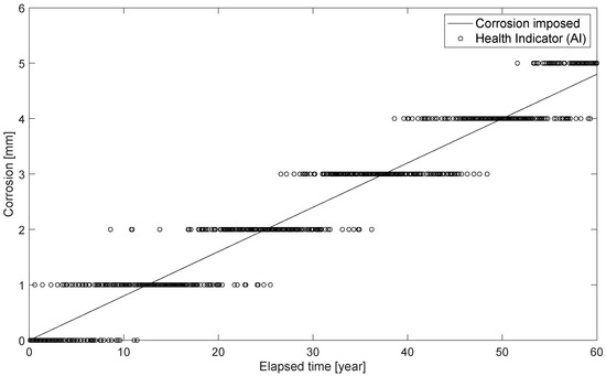 Figure 14) were initially discarded because structural and infrastructure works are typically unique, thus it is difficult to have the required data for the operating conditions, including degradation data. These models require as input a single health indicator, which, herein, is derived from the raw data obtained from the AI model, i.e., the estimated corrosion thickness, as indicated in the previous section. The degradation models used herein is the exponential model, which implements a stochastic model with an exponential degradation over time [