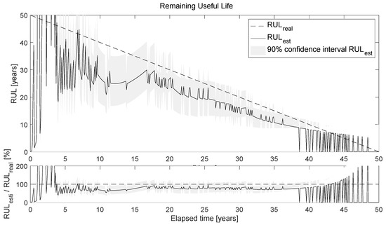 est). The confidence interval of the latter is also given. The bottom graph shows the ratio RUL