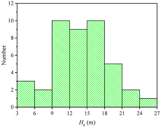 According to the statistics [7], the form of deep excavation in the case histories is mainly the basement of high-rise buildings, which usually has a large excavation area, deep excavation depth, and strong unloading effect, and it has a significant effect on the adjacent existing tunnels. Figure 2 shows a histogram of excavation depth He. It is observed that the distribution range of He is 3–27 m, in which 9–12 m and 15–18 m account for the highest proportion, and the number of deep excavations with He ≤ 18 m accounts for about 81.0% of the total case histories.