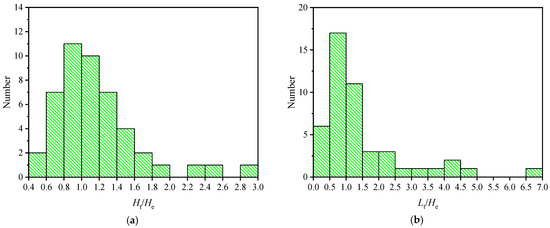 Figure 3 shows a histogram of the relative position between the tunnel and deep excavation. It is observed from Figure 3a that the value of Ht/He used to characterize the vertical position of the tunnel is in the range of 0.4–3.0, in which 0.8–1.0 accounts for the largest proportion, and the tunnels with Ht/He ≤ 1.0, 2.0, and 3.0 account for 42.6%, 93.6%, and 100%, respectively. It is observed from Figure 3b that the value of Lt/He used to characterize the horizontal position of the tunnel is in the range of 0–7.0, in which 0.5–1.0 accounts for the largest proportion, and the tunnels with Lt/He ≤ 1.0, 2.0, and 3.0 account for 48.9%, 78.7%, and 87.2%, respectively.
