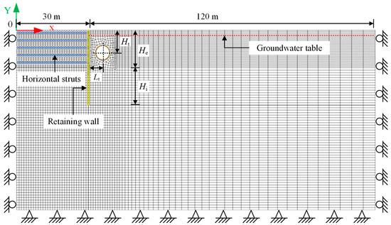 In the model, the soil is simulated using a plane strain element; the retaining wall, horizontal struts and existing tunnel are simulated using a beam element; and the contacts between the retaining wall soil and tunnel soil are simulated using an interface element. To increase the calculation efficiency and ensure calculation accuracy, the mapping mesh is used. The mesh size near the deep excavation and tunnel is 1 m, and that near the boundary is 5 m.