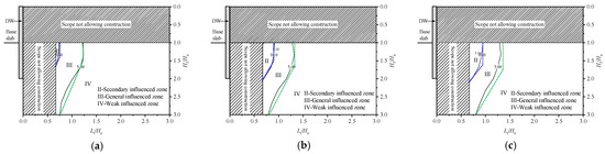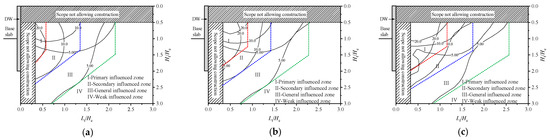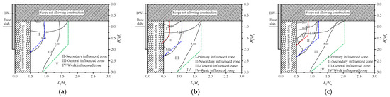 Influenced zone of deep excavation on adjacent tunnel displacement (He = 12 m): (a) δhm = 0.18%He; (b) δhm = 0.3%He; (c) δhm = 0.7%He.