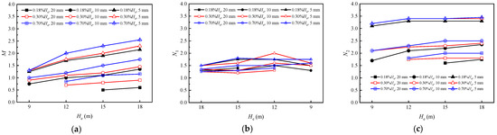 Figure 10 shows the effect of He on M, N1 and N2. It is observed from Figure 10a when the maximum retaining wall deflection and the tunnel displacement control standards are constant, M has a trend towards increasing linearly with He, i.e., the deeper of excavation, the wider the influenced zone obtained. It is observed from Figure 10b, He has no obvious effect on N1, and N1 varies between 1–2 with an average of about 1.5. It is observed from Figure 10c that when the maximum retaining wall deflection and the tunnel displacement control standards are constant, N2 has a trend towards increasing linearly with He, and this trend is more obvious when the tunnel displacement control standards are 20 mm and 10 mm.