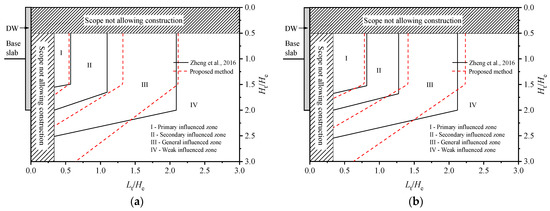 To verify the proposed method for predicting the influenced zone of deep excavation under any He and δhm conditions, the prediction results obtained from this method are compared with those in current research. Zheng et al. [27] gave the determination parameters of the influenced zone of deep excavation under the conditions of He = 18 m, δhm = 30 mm, 45 mm, and 60 mm, as shown in Table 4.