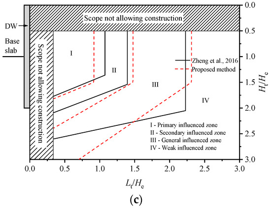 Comparison of the predicted influenced zone with the results in current research: (a) He = 18 m, δhm = 30 mm; (b) He = 18 m, δhm = 45 mm; (c) He = 18 m, δhm = 60 mm [27].