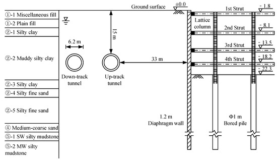 The project is in Nanjing, China, and it is a basement excavation of a commercial center with three super high-rise buildings. The total perimeter of the basement is about 930 m, the average excavation depth in the podium building area is 22.3 m, and the maximum excavation depth in the tower building area is 34 m. The supporting system of the basement consists of a diaphragm wall, horizontal reinforced concrete struts, and vertical steel lattice columns. On one side of the basement, there exist the down-track and up-track tunnels of Nanjing Metro Line 2. The outer diameter of the tunnels is 6.2 m, the average burial depth of the tunnel’s crown is 15 m, and the average horizontal spacing from the up-track tunnel to the basement is 33 m, as shown in Figure 15.