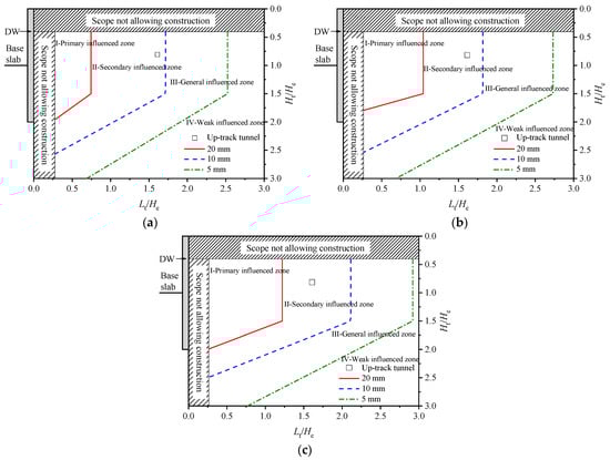 Influenced zone of deep excavation on adjacent tunnel displacement (He = 9 m): (a) δhm = 0.18%He; (b) δhm = 0.3%He; (c) δhm = 0.7%He.