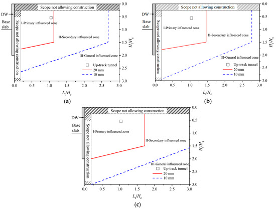 Influenced zone of deep excavation on adjacent tunnel displacement (He = 15 m): (a) δhm = 0.18%He; (b) δhm = 0.3%He; (c) δhm = 0.7%He.