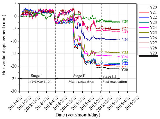 Figure 18 shows the horizontal displacement evolution curves of the up-track tunnel. Y20–Y29 are the monitoring sections along the longitudinal direction of the tunnel. If the tunnel is regarded as an initial state with no additional displacement before basement excavation, the maximum horizontal displacement of the tunnel induced by basement excavation is about 18 mm, which appears in the monitoring section Y20 corresponding to the tower building area.