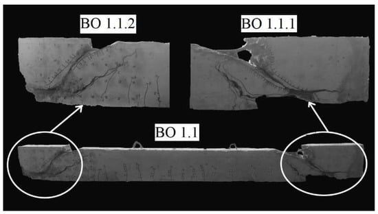 When the load was further increased, the ends of the fabric tape completely peeled off, and their anchoring failed. The exhaustion of the bearing capacity occurred at the moment of exfoliation of the concrete compressed area, together with the sharp elongation of the tape and the damage of the cover of the FRCM system in the area of propagation of the inclined crack (Figure 2).