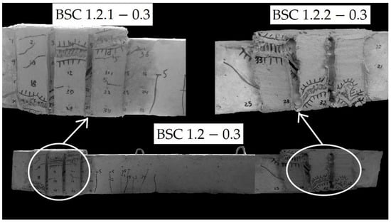 In the second stage, reinforced concrete beams were reinforced by sticking P.B.O. fabric in the form of vertical strips with a width of 70 mm for the possibility of fixing concrete strains in the support areas (Figure 2). Beams were tested according to the following program: BS 1.1–0, strengthened without initial load; BS 1.2–0.3 and BS 1.3–0.5—at the initial load level equal to 0.3 and 0.5 from the destructive one determined by experimental tests of unreinforced samples. The criterion for exhausting bearing capacity was adopted from unreinforced samples: the exhaustion of the shear strength was equated to the physical destruction of the compressed concrete area of the samples.