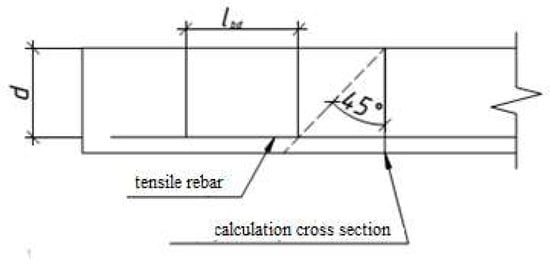Longitudinal reinforcement was taken into account in the calculation only if it was installed at a distance beyond the projection of the calculated section at an angle of 45°. In this case, —the minimum required anchoring length of longitudinal reinforcement (Figure 4).