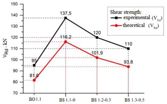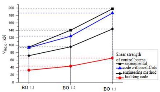 The above expressions were tested to calculate the bearing capacity of tested samples without internal transverse reinforcement. The value of the shear strength of the control samples is determined according to the current code, and consider the refined value CRd,c determined according to Equation (13). Result of the theoretical calculation data is shown in the Table 6.