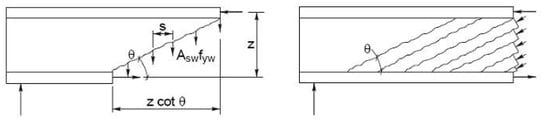 For a long time in Eastern Europe, codes [38] allowed the calculation of the bearing capacity on the shear according to the engineering method. Figure 3 shows the distribution of forces in the calculation scheme from the distributed load q (or equivalent action F) and the occurrence of forces in concrete Qb and transverse reinforcement RswAsw, which is located with step s. The bearing capacity of such an element is considered at the section on the length of the projection of a diagonal crack on the longitudinal axis (c—length for reinforcement, c0—for concrete).