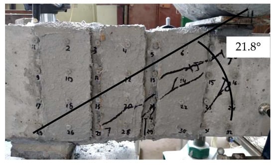 The angle θ was determined along the diagonal crack in which the destruction of the element took place. However, it should be noted that the angle of inclined struts extends from the point of the center of force applied to the face of the element’s support (Figure 8).