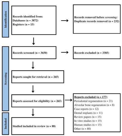 In November 2022, electronic searches were conducted in the following databases: PubMed (National Library of Medicine), Web of Science (Clarivate Analytics), and Scopus (Elsevier). These comprised both MeSH and free-text terms. The following search strategy was applied: ((“bone tissue engineering” [MeSH Terms] OR (“tissue” [All Fields] AND “engineering” [All Fields] AND “mandible” [All Fields]) OR “bone tissue engineering” [All Fields]) OR (“tissue scaf-folds” [MeSH Terms] OR (“tissue” [All Fields] AND “scaffolds” [All Fields]) OR “tissue scaffolds” [All Fields] OR (“tissue” [All Fields] AND “scaffold” [All Fields]) OR “tissue scaffold” [All Fields]) OR (“mandible reconstruction” [MeSH Terms AND “engineer-ing” [All Fields]] OR (“reconstructive” [All Fields] AND “surgical” [All Fields] AND “pro-cedures” [All Fields]) OR “mandible reconstruction” [All Fields] OR “reconstruction” [All Fields]) OR (“bone morphogenetic proteins” [MeSH Terms] OR (“bone” [All Fields] AND “morphogenetic” [All Fields] AND “proteins” [All Fields]) OR “bone morphogenetic pro-teins” [All Fields] OR (“bone” [All Fields] AND “morphogenetic” [All Fields] AND “pro-tein” [All Fields]) OR “bone morphogenetic protein” [All Fields]) OR (“bone marrow cells” [MeSH Terms] OR (“bone” [All Fields] AND “marrow” [All Fields] AND “cells” [All Fields]) OR “bone marrow cells” [All Fields]) OR (“intercellular signaling peptides and proteins” [MeSH Terms] OR (“intercellular” [All Fields] AND “signaling” [All Fields] AND “peptides” [All Fields] AND “proteins” [All Fields]) OR (“growth” [All Fields] AND “factors” [All Fields]) OR “growth factors” [All Fields])) AND ((“mandible” [MeSH Terms] OR “mandible” [All Fields]) OR ((“mandible” [MeSH Terms] OR “mandible” [All Fields] OR “mandibular” [All Fields]) AND (“critical sized defect” [All Fields]) AND defect [All Fields])). The retrieved references were exported to the EndNote software 20.5 (Windows) (Clarivate Analytics, Philadelphia, PA, USA) to identify the duplicates.