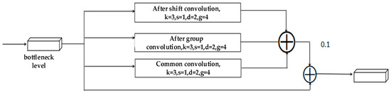 The U-Net is initially composed of eight convolutional layers with a downsampling structure, no pooling layer, and the activation function of the network is the LeakyReLU function. Then, the multi-scale convolution module is added after the bottleneck layer of U-Net, which has three convolutions in parallel. The first convolution employs shift convolution and separates the network’s feature map into two parts, labeled A and B. The AB feature maps are transposed to create the BA combination, which is then subjected to group convolution and dilated convolution with g = 4 and d = 2, respectively. This increases the receptive field from 3 × 3 to 5 × 5. The second convolution is grouped convolution, which is divided into four groups and then convolved separately, and the last convolution layer is ordinary convolution. The three convolution operations are summed in parallel, then multiplied by a factor of 0.1 and summed with the input before convolution. This is equivalent to adding another residual operation to transpose the output of this module for convolution.