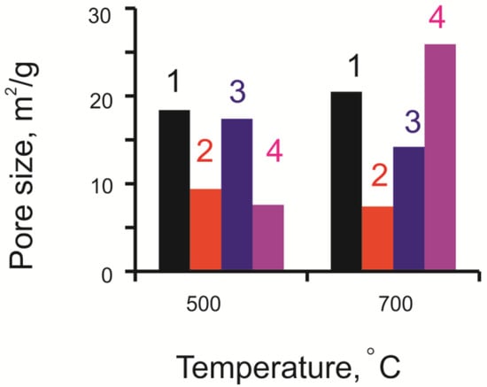 The samples were prepared using various methods of functionalization of the oxide matrix: a one-stage synthesis where the active component was incorporated at the stage of sol formation (S-series), and the PT, where the formation of nanoparticles occurred in the presence of a support (P-series) using acetate and cerium chloride as a support precursor (Table 1). All synthesized materials had a type H3 hysteresis loop on their adsorption isotherm with a type IV (Figure S2) characteristic of adsorbents formed by plane-parallel particles. Indeed, it was shown by SEM that catalyst samples prepared from cerium chloride by a one-stage synthesis were irregularly shaped plates with a polydisperse pore system (Figure S3). The evaluation of the uniformity of the doping cation distribution using SEM confirmed the homogeneity of the materials obtained. The hysteresis at p/po = 0.5 ÷ 0.9 indicated the presence of a predominantly textural mesoporosity [50]. Compared to the corresponding support, the catalysts showed a drop of BET surface areas (SBET), pore volumes (Vpore), and average pore diameters (Dpore), which indicated that the NiO particles were located in the pores of the mesoporous CeO2-MgO. In the differential pore distribution curve of the catalyst, the maximum shifted towards larger pore sizes and the curve broadened when cerium chloride was used instead of cerium acetate (SI, Figure S3). The Ni/CeMg-A-S-V samples prepared from cerium acetate by the one-stage synthesis and activated in vacuum had the narrowest distribution of pore sizes, being apparently associated with less pore clogging. Dpore increased when Ce(III) chloride was used as a support precursor, for an A catalyst calcined in air, and with a rise in the calcination temperature (Figure 1). In the first case, large pores were formed already at the stage of sol formation; in the second and third cases, the destruction of the mesoporous structure of the support proceeded with an increase in the activation temperature. The decomposition of support precursors was an exothermic reaction; the release of heat led to the combustion of the template in air and a spontaneous increase in temperature. Dpore of the Ni/CeMg-A-S-V and Ni/CeMg-A-S-O catalysts prepared from cerium acetate by the one-stage synthesis did not increase with increasing temperature (Figure 1). Thus, to create a stable mesoporous structure with a smaller pore size of Ni/CeMg catalysts, we had to use the one-stage synthesis, cerium acetate as a precursor, and an activation in vacuum.