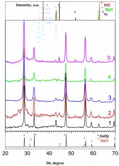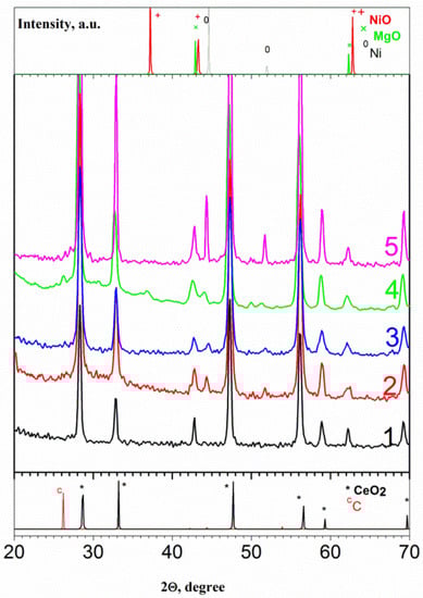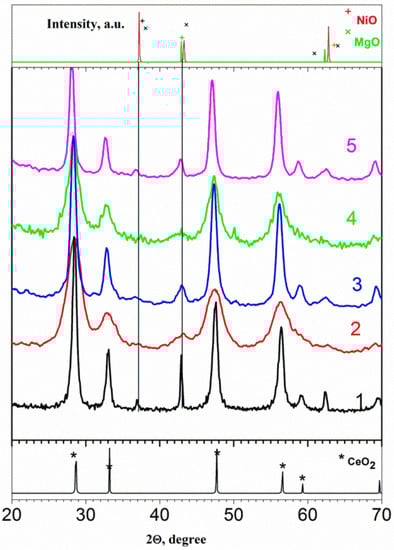 X-ray diffraction patterns of the catalysts after the CSMR reaction at 750 °C. 1—Ni/CeMg-C-S-O; 2—Ni/CeMg-A-S-V; 3—Ni/CeMg-A-S-O; 4—Ni-Pd/CeMg-A-S-V; 5—Ni/CeMg-A-P-O.