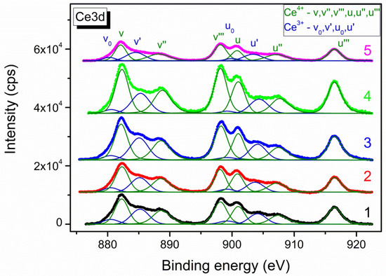 Ce3d XPS spectra of the catalysts reduced at 800 °C. 1—Ni/CeMg-C-S-O; 2—Ni/CeMg-A-S-O; 3—Ni/CeMg-A-S-V-500; 4—Ni-Pd/CeMg-A-S-V, 5—Ni/CeMg-A-P-O.