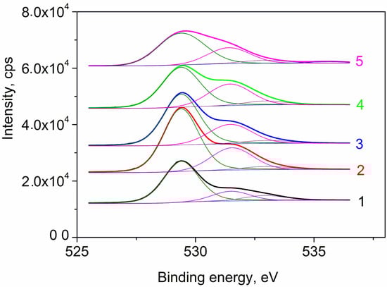 O1s X-ray photoelectron spectra of the catalysts reduced at 800 °C. 1—Ni/CeMg-C-S-O; 2—Ni/CeMg-A-S-O; 3—Ni/CeMg-A-S-V-500; 4—Ni-Pd/CeMg-A-S-V, 5—Ni/CeMg-A-P-O.