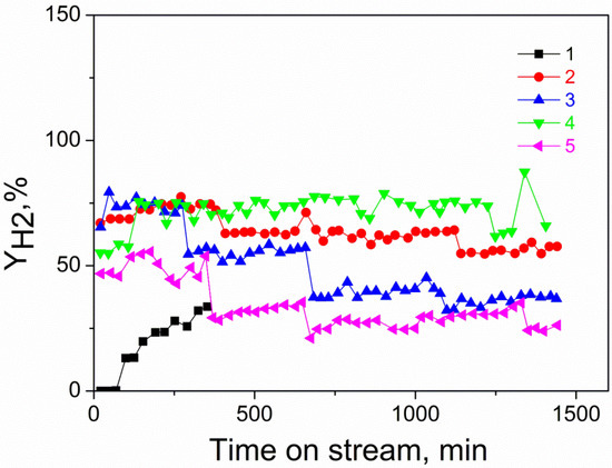 Hydrogen yield during CSMR at 750 °C. 1—Ni/CeMg-C-S-O; 2—Ni/CeMg-A-S-V; 3—Ni/CeMg-A-S-O; 4—Ni-Pd/CeMg-A-S-V; 5—Ni/CeMg-A-P-O.